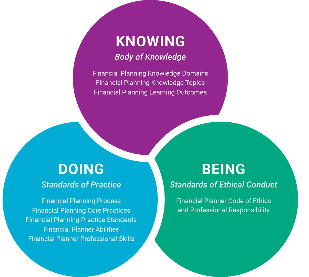 The standards are organized within a framework that integrates financial planning knowledge, professional practice standards and ethics, known as KNOWING | DOING | BEING: